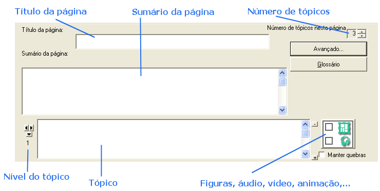Tópicos - no cimo, à direita, do formulário de diálogo pode seleccionar quantos tópicos ou seja quantas marcas constituem a página e que serão apresentados ao formando. Poderá então inserir a informação relativa a cada tópico nas caixas respectivas.
