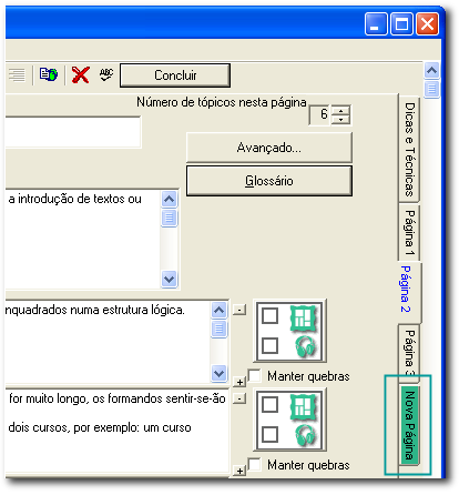 É possível inserir num capítulo o número de páginas que necessita (até 60 páginas por capítulo na actual versão) bastando para isso clicar no ícone Nova página.