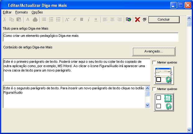 | 3 | Neste campo - Conteúdo de elemento Diga-me mais - deve ser inserido o conteúdo a apresentar. Para separar parágrafos devem ser inseridos dois "ENTER". |