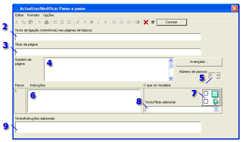 | 4 | O campo com o título será utilizada para criar o título que se encontra no topo da página Passo-a-passo. Deverá constituir num curto parágrafo que explicite o objectivo e conteúdo da página Passo-a-passo. |