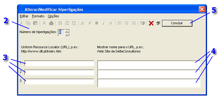 | 3 | Insira o endereço URL (web page) neste campo. Quando o formando clicar neste endereço o browser mostrar-lhe-á a página endereçada. Por exemplo, http://www.dlt.pt/ ou ainda http://www.readygo.com/ |