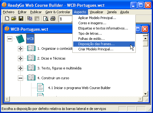 Pode alterar a disposição da barra lateral e da barra de serviços que aparecem no seu curso. Para aceder a essa funcionalidade, escolhe Aspecto/Disposição das Frames no menu.