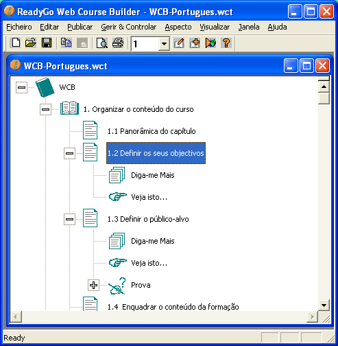 A janela principal do Web Course Builder apresenta ao autor a estrutura do curso em árvore segundo os capítulos, páginas de tópicos e elementos pedagógicos que constituem o curso. Esta árvore pode ser utilizada para, de forma fácil e intuitiva, rearrumar ou rearranjar os capítulos, páginas de tópicos e elementos pedagógicos segundo a ordem de aprendizagem mais adequada.