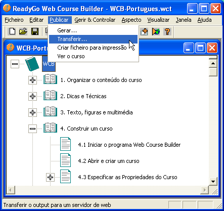 Depois de gerar pretenderá, naturalmente, colocar o seu curso acessível aos formandos. Trata-se de transferir ou enviar o curso para o servidor de formação a distância ou seja iniciar a transferência electrónica do conjunto de ficheiros que constituem o código htm do curso e ficheiros associados (figuras, áudio, etc. ) para o servidor.