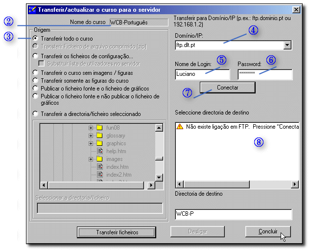 | 9 | De pois de ter com sucesso entrado no servidor esta janela irá apresentar os ficheiros que se encontram no servidor. Deverá então seleccionar a directoria onde pretende alojar o curso. A directoria de destino será apresentada na janela inferior. Note que o botão Transferir ficheiros não fica activo antes de estabelecer uma conexão válida e seleccionar um destino para a transferência de ficheiros. |