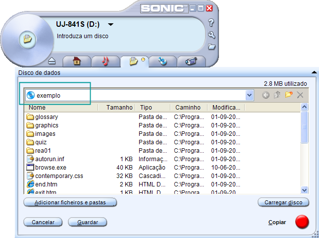 Insira um disco óptico (CD ROM ou DVD) na sua unidade de gravação e abra o programa com o qual irá gravar o disco. O objectivo consiste em carregar, na área de listagem do programa de gravação, o conteúdo da directoria onde se encontram os ficheiros gerados pelo Web Course Builder no processo de construção do curso.