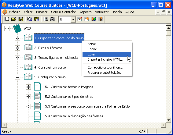 Na árvore do curso clicar no ponto de inserção dos slides e, em seguida clicar o botão direito do rato. Isto fará aparecer um menu pendente onde deverá seleccionar a opção colar.