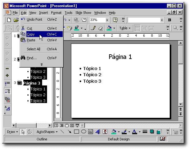 | 1 | Abrir a apresentação PowerPoint existente em esquema de página, e seleccionar os slides ou páginas que pretende copiar. |