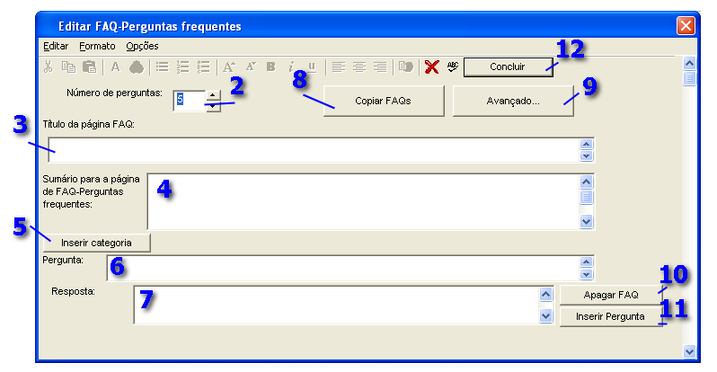 ![]() Para apagar uma pergunta anule o texto contido nessa pergunta e diminua em um o número de perguntas que constituem as FAQs. |